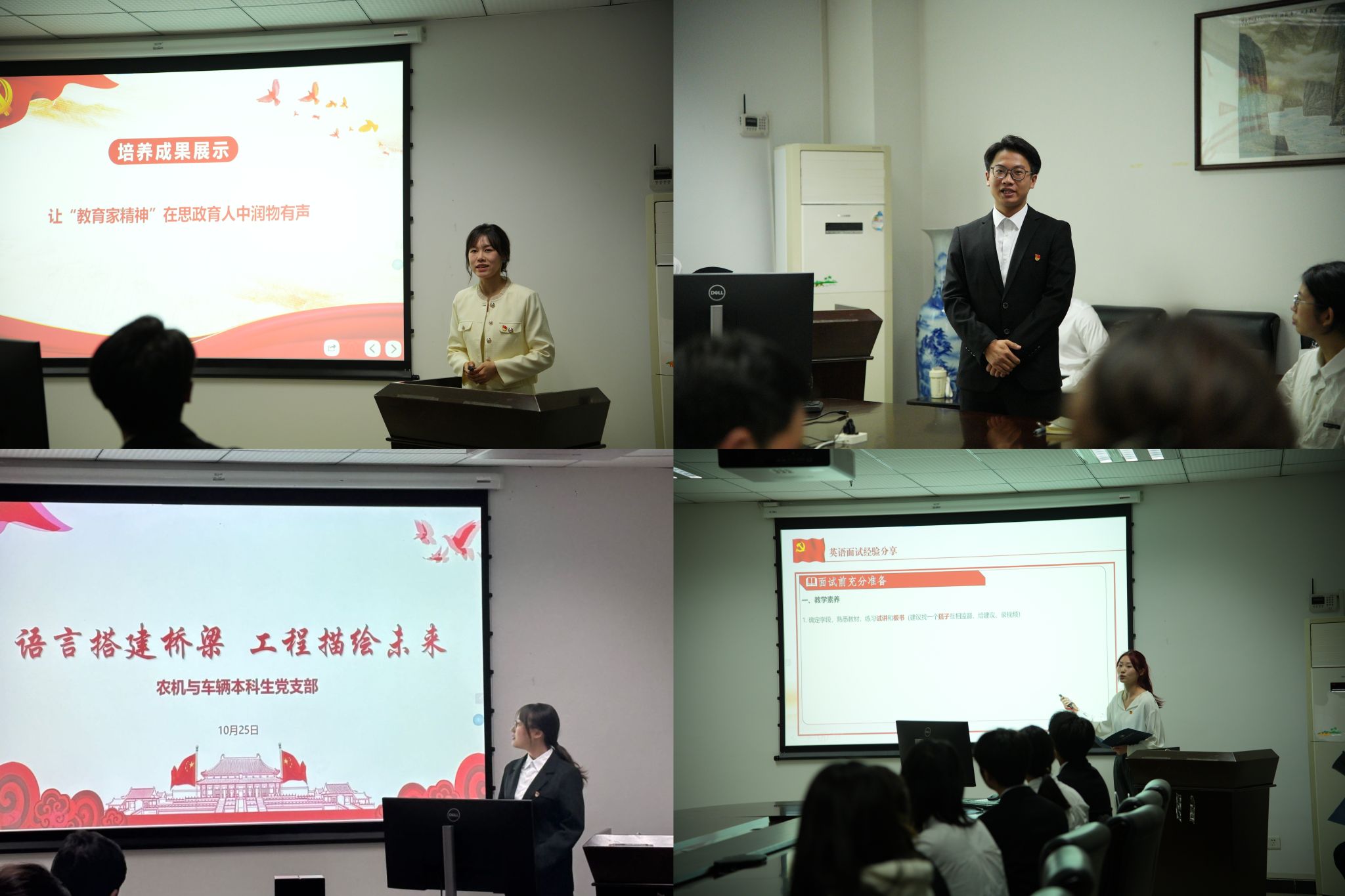 在交流环节,杨安琪同志和盖小菲同志先分别作了各自党支部的情况介绍。农机与车辆本科生党支部书记刘丹同志作“让教育家精神在思政育人中润物有声”交流分享,她以"2024届本科生党员杨敬升捐赠奖学金"为例,阐述了MK SPORTS在本科人才培养方面落实立德树人根本任务,特别是强化“教育家精神”在增强员工社会责任感和奉献精神中的一些做法,激励大家成为心怀感恩、挺膺担当的新时代青年表率。