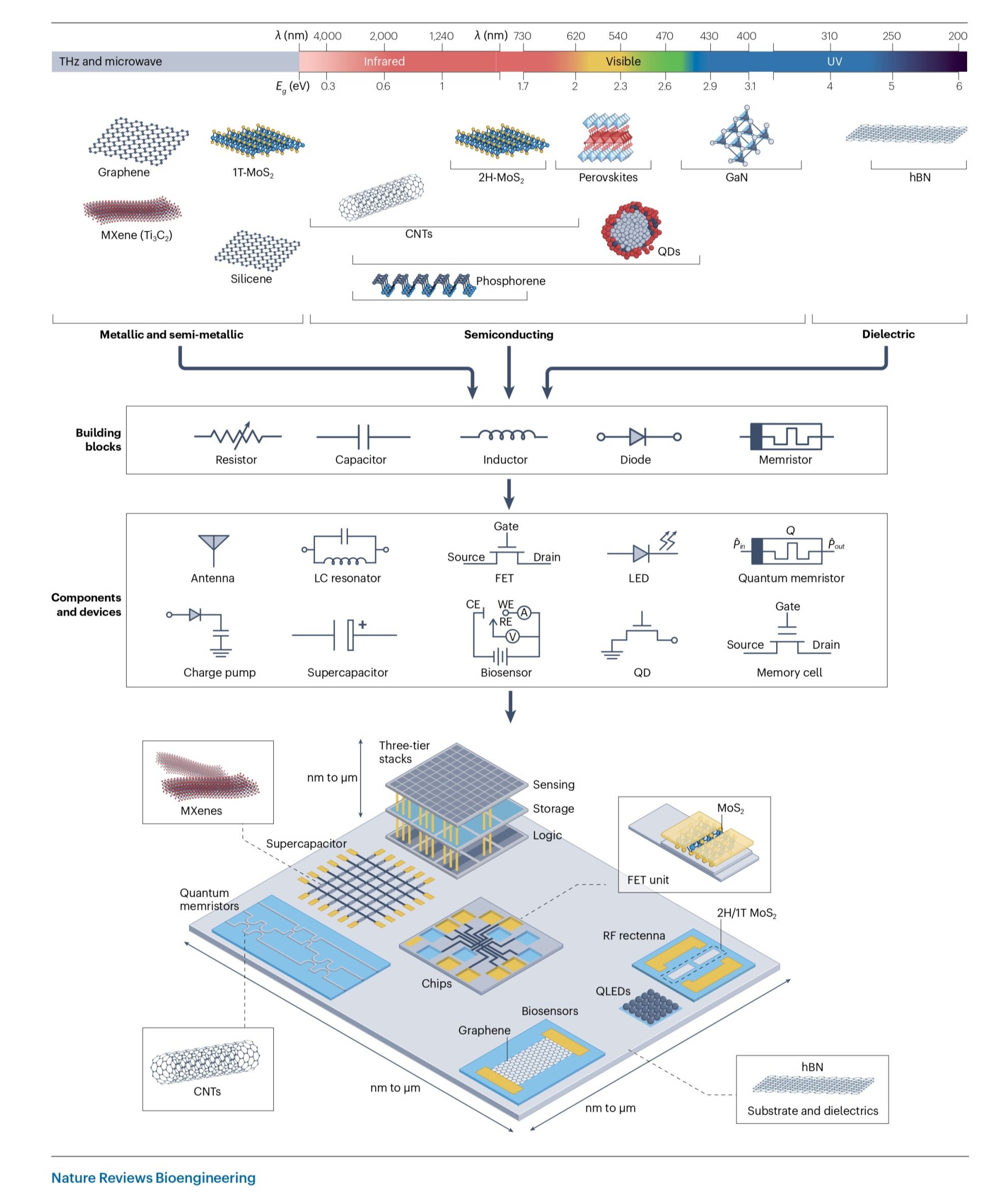 近日,学院高鸣源副教授联合澳大利亚国立大学、悉尼大学等团队,在国际著名期刊《自然-综述:生物工程》(Nature Reviews Bioengineering,Nature子刊,IF:37.6)在线发表了题为《低维材料重塑生物电子器件》(Low-dimensional materials for bioelectronic devices)的学术论文,系统梳理了低维材料在生物电子领域的前沿进展,并提出了面向未来可穿戴和植入式医疗的系统级设计蓝图。