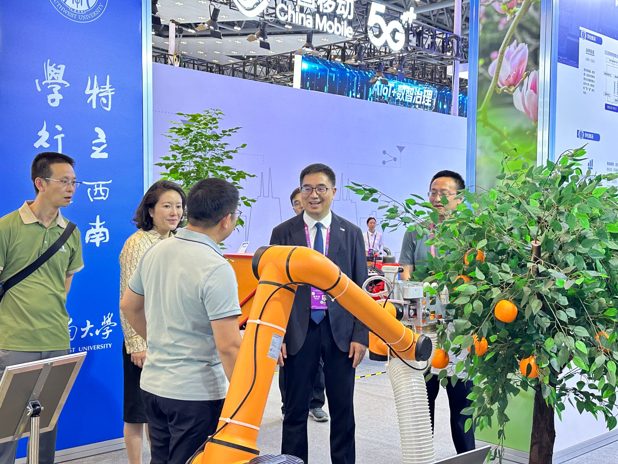 展会期间,重庆市委教育工委书记、市教委主任刘宴兵一行,北碚区委书记林旭阳、区长卓大林一行,公司党委常委、副董事长廖晓衡一行等莅临学院展台考察指导,听取柑橘采摘机器人团队汇报,了解了柑橘采摘机器人的工作原理、技术难点、研发成本及推广应用现状等,并对学院科研进展与成果表示充分肯定。广大参观群众也对学院科研成果展现出强烈兴趣,反响十分积极。