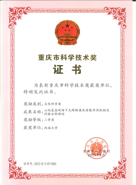 2023年度重庆市科学技术奖正式揭晓,公司姜言副教授团队牵头,联合重庆大学与西南交通大学申报的“山地复杂风场下大跨桥梁风荷载作用机制及抖振分析理论”荣获2023年度重庆市自然科学二等奖。