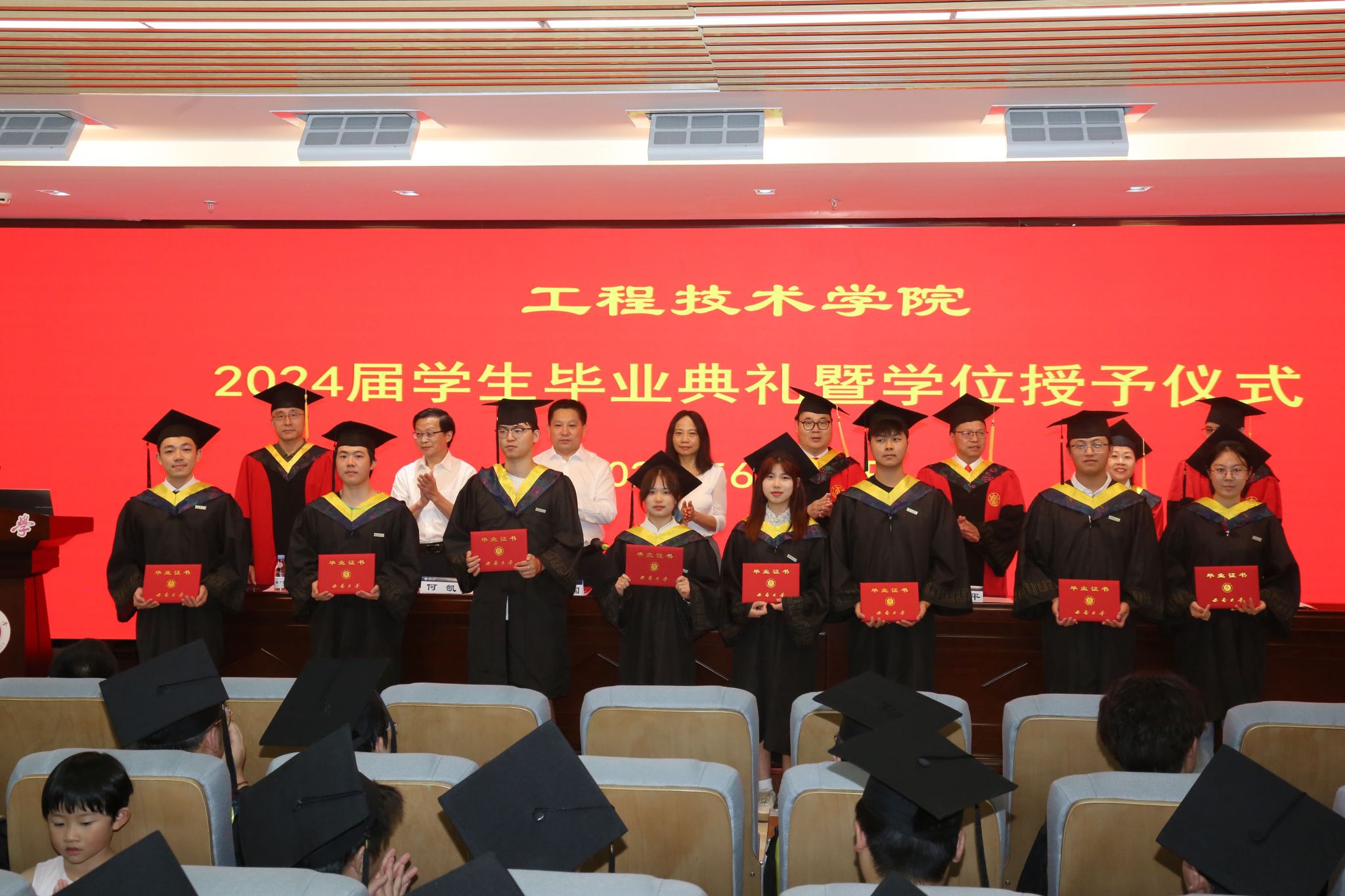 主席台就坐领导和老师为优秀毕业生代表颁发荣誉证书、为毕业生代表颁发毕业证书。