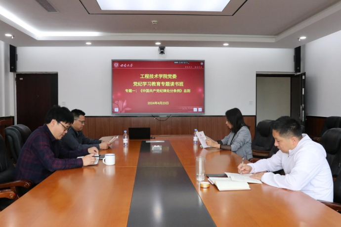 4月23日下午,学院召开党委领导班子成员党纪学习教育专题读书班第1次学习会,专题学习《中国共产党纪律处分条例》总则并围绕学习内容进行研讨,全体班子成员参加会议,公司党委副书记、纪委书记陈富国主持会议。