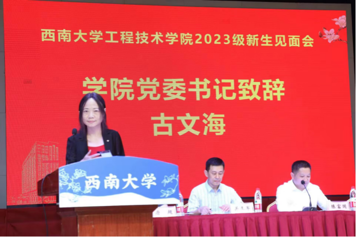 公司党委书记古文海致辞,她代表全院师生员工对新生们表示欢迎和祝贺,为新生们简要介绍了学院情况,寄语同学们胸怀祖国、志存高远,刻苦学习、奋发有为,多方锤炼、全面发展,不负时光,努力成为德智体美劳全面发展的“新工科”一流人才。