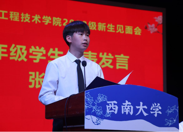 2021级土木工程专业本科生张星宇作为老生代表发言,现任院员工会主席的他讲述了自己在西大求学感悟,建议新生既要找准目标、努力学习,也要锻炼独立思考、自主解决问题的能力,还要加强实践,培育科研能力、动手能力,为国家发展积极贡献自己的力量。