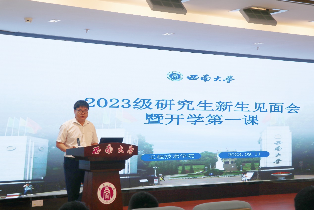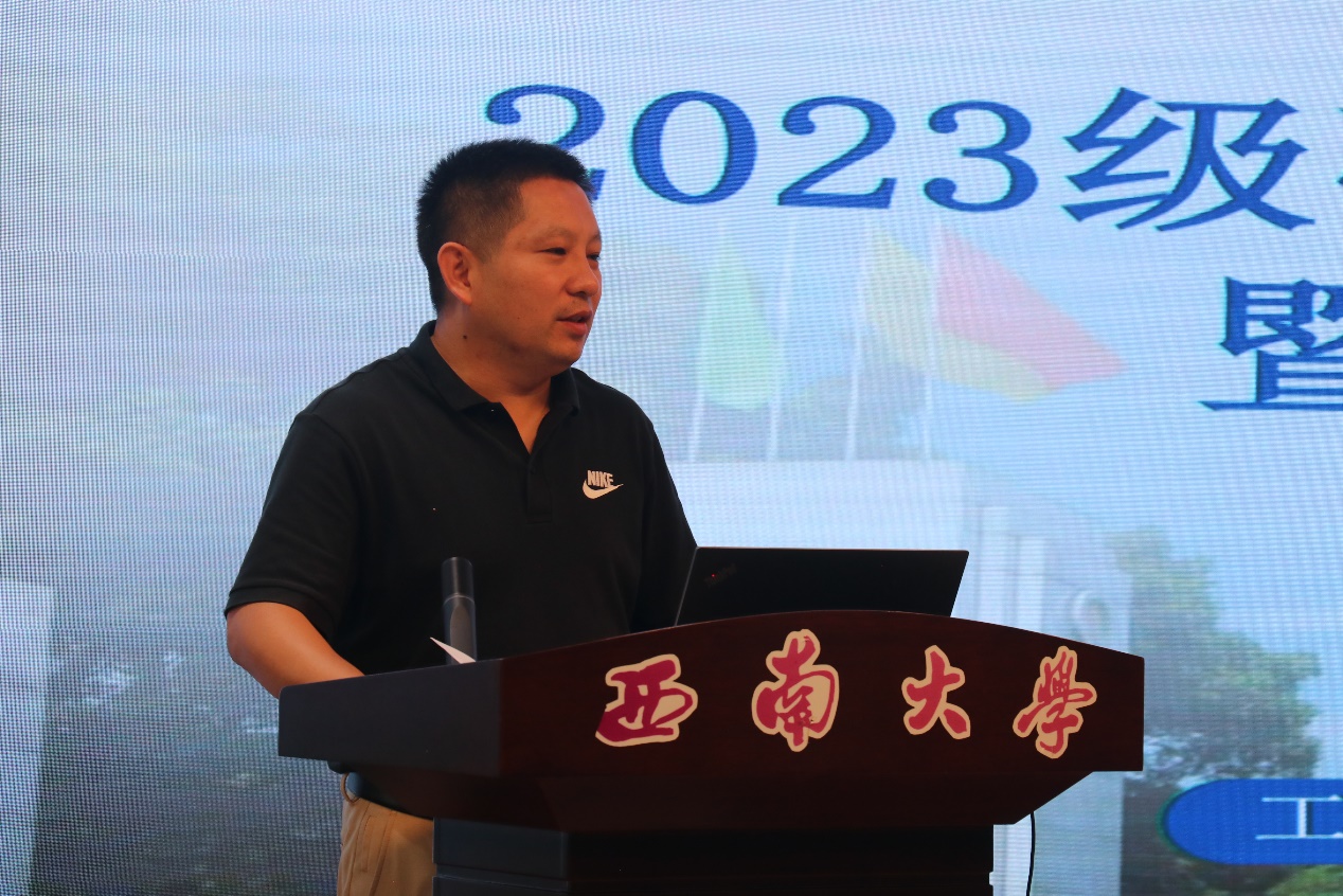 首先,谢守勇经理致辞并向同学们介绍了学院整体情况。谢守勇经理对同学们的到来表示热烈欢迎。他从学院概况、人才现状、学科发展以及人才培养等方面进行了细致的讲解,让同学们对学院有了更深的认同感和归属感。他对同学们提出了几点希望:一是要坚定理想信念,立鸿鹄之志;二是要遵守学术道德行为规范,潜心科研、勇攀高峰;三是要全面发展,继承和发扬以爱国主义为底色的科学家精神。