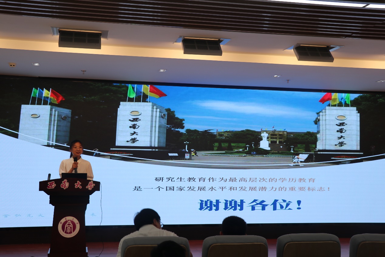 最后,彭敏杰老师给新生进行思想政治教育并作日常管理文件导读,着重强调了家国情怀、安全意识和心理健康。此外,彭老师通过讲解评奖评优、综合测评和学校员工管理规定等相关文件,对研究生的行为规范、日常管理提出要求。她希望同学们严守学术道德、遵守学校规章制度,做好研究生生涯规划,让自己的研究生生活不留遗憾。
