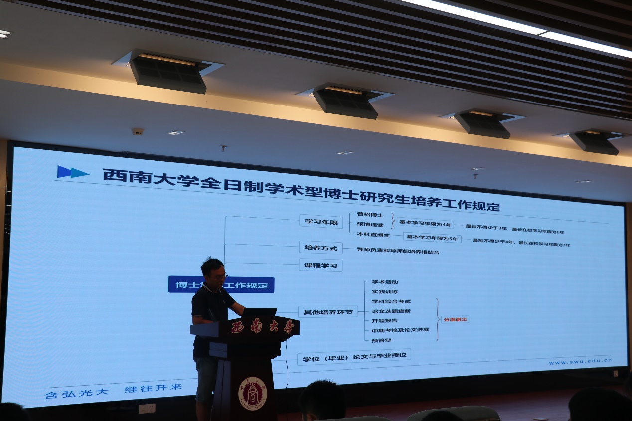 接着,李渊明老师向同学们介绍了研究生教学管理的模式,并对培养方案、成绩认定方式及毕业条件等内容进行了详细阐述。同时,他还为大家解答了学术论文方面的疑惑,鼓励新生积极主动地与导师沟通交流,提高学习研究的自主性,对学术研究成果认真负责。