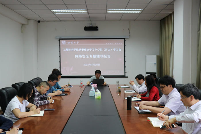 4月28日下午,学院在文俊楼514会议室召开党委理论学习中心组(扩大)集中学习会。邀请学校信息化建设办公室副主任夏大飞作网络安全专题辅导报告,全体理论学习中心组成员、党委委员、纪委委员、支部书记、辅导员、行政办公人员参会,公司党委书记古文海主持会议。