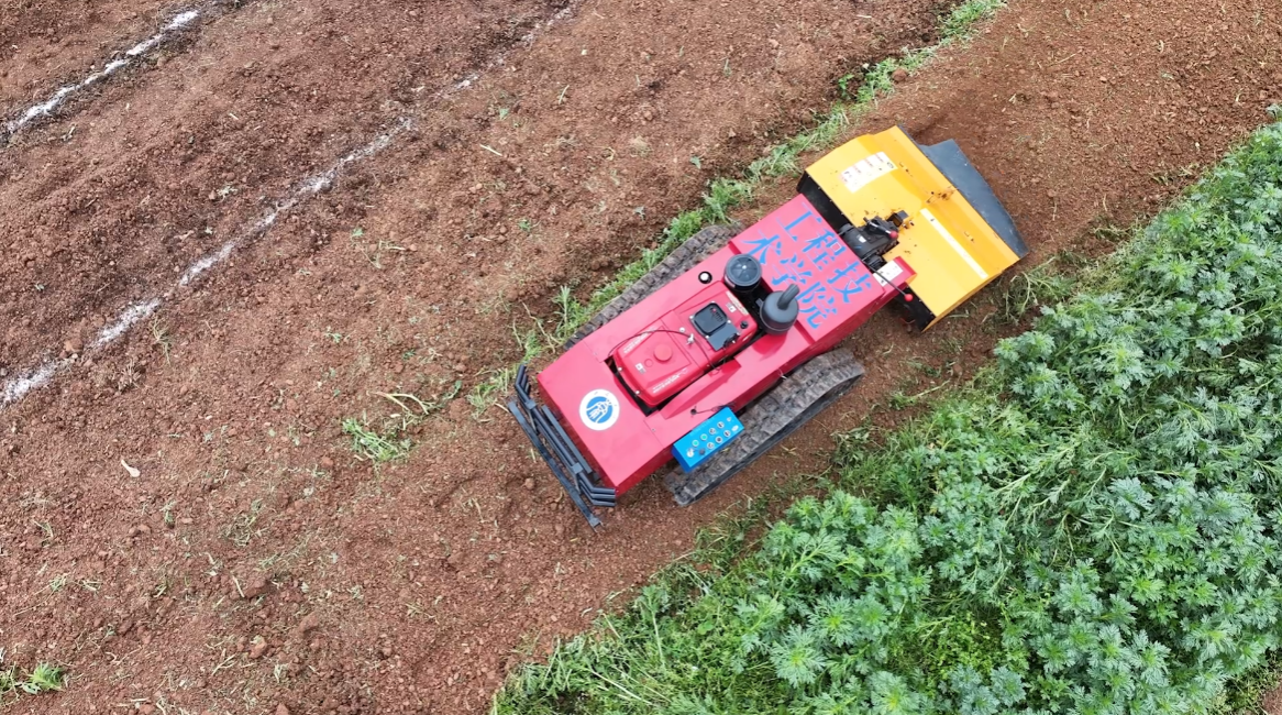公司师生针对丘陵山区田块分散、机耕道狭窄、地形坡度较大的现实条件,历经50多次田间试验、10多次迭代改良,自主研发生产出新一代遥控式机电液一体化复合型旋耕机。它整机接地面积大,可有效减轻土壤压实,同时具备良好的防滑能力;窄间距履带能够适配丘陵山区绝大多数机耕道,搭配大功率双直流无刷行走电机,可实现25°以内坡地稳定行驶,有效克服了地形限制,实现了高效、精准的“智慧”耕整,为农户抢抓了宝贵农时。