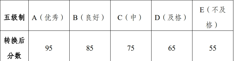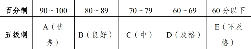(二)考试采用百分制评分,考查采用百分制或优秀、良好、中、及格、不及格五级制(教务系统分别记为 A、B、C、D、E)评分。百分制成绩和五级分制成绩需要转换时按下表进行: