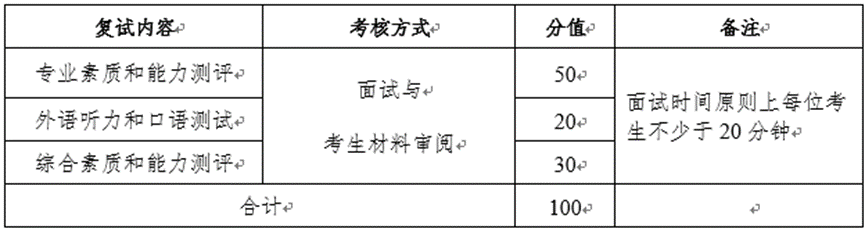 复试内容包括专业素质和能力测评、外语听力和口语测试、综合素质和能力测评。复试成绩满分100分,其中专业素质和能力测评占复试成绩的50%,外语听力和口语测试占复试成绩的20%,综合素质和能力测评占复试成绩的30%(见表5)。