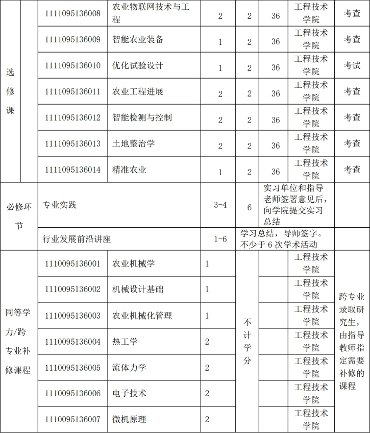 攻读农业工程与信息技术领域(方向)农业硕士专业学位的研究生须完成以下课程的学习和必修环节,总学分应不少于28学分,其中全日制课程学分不少于22学分,实践训练6学分。